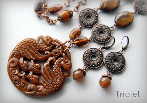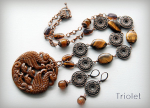 Диаметр кулона 5,7 см, длина 60 см (могу скорректировать). Состаренный нефрит, тигровый глаз, агат, чешское стекло.