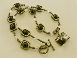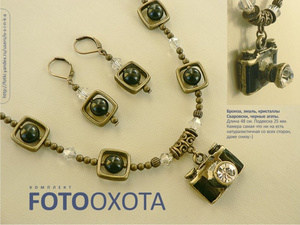 Комплект Fotoохота: бронзовые фурнитура и бусины, эмаль, черные агаты, кристаллы Сваровски Crystal Clear 6 мм, ювелирный тросик, замок-тоггл. Камера самая что ни на есть натуралистичная со всех сторон, даже снизу! Объектив сверкает с расстояния в несколько метров, Сваровски по шнуру тоже дают "вспышки" на свету:-)). Длина кулона по шнуру — 48 см. Размер подвески 25 мм. Комплект 1200 руб.
