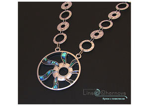 Основа кулона - ювелирный тросик. Длина колье 40,5 см, за счет удлинительной цепочки варьируется до 46,5 см.