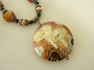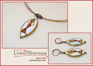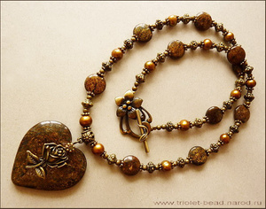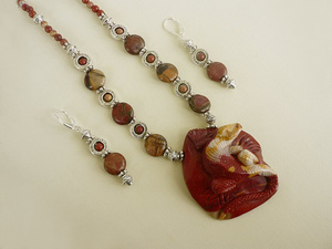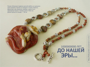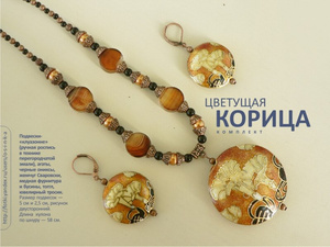 Комплект "1000000000 лет до нашей эры...": резная объемная подвеска ручной работы из цельного куска мукаита, бусины из мукаита и яшмы Пикассо, фурнитура под черненое серебро, замок-тоггл, ювелирный тросик. Кулон уникальный! Я первый раз вижу каменную фигурку ящерицы, проработанную до такого поразительного сходства с живым прообразом:-) Размер камня — 7х5х2 см. Длина кулона по шнуру — 56 см. Серьги на серебряных швензах. В комплекте роскошная подарочная коробка. 2000 руб.Комплект из серии «Восточные специи» с бусинами-«клуазонне» (ручная роспись в технике перегородчатой эмали, рисунок на бусинах двусторонний). «Цветущая корица»: агаты, черные ониксы, жемчуг Сваровски, медная фурнитура и бусины, ювелирный тросик, замок-тоггл. Размер подвесок — 5 см и 2,5 см. Длина кулона — 55 см. В комплекте подарочная коробка. 1400 руб.