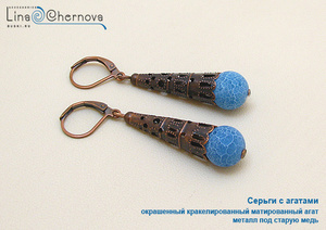 Окрашенный в нежно-голубой цвет, кракелированный матированный агат прекрасно контрастирует с металлом цвета старой меди.