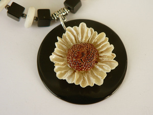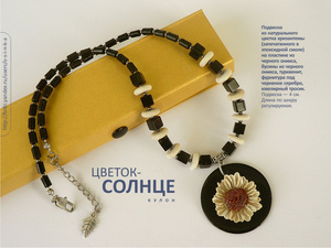Кулон "Цветок-солнце": подвеска из натурального цветка хризантемы (запечатанного в эпоксидной смоле) на пластине из черного оникса, бусины из черного оникса, турквенит, фурнитура под черненое серебро, ювелирный тросик. Подвеска — 4 см. Длина по шнуру регулируемая. В комплекте подарочная коробка. 1350 руб. Возможно изготовление серег в комплект.