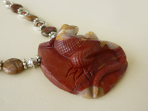 Комплект "1000000000 лет до нашей эры...": резная объемная подвеска ручной работы из цельного куска мукаита, бусины из мукаита и яшмы Пикассо, фурнитура под черненое серебро, замок-тоггл, ювелирный тросик. Кулон уникальный! Я первый раз вижу каменную фигурку ящерицы, проработанную до такого поразительного сходства с живым прообразом:-) Размер камня — 7х5х2 см. Длина кулона по шнуру — 56 см. Серьги на серебряных швензах. В комплекте роскошная подарочная коробка. 2000 руб.