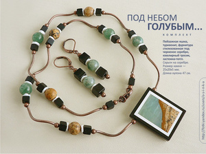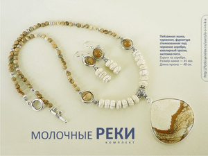 Два комплекта из серии "Картины в камне". "Молочные реки": пейзажная яшма, турквенит цвета слоновой кости, фурнитура стилизованная под черненое серебро, замок-тоггл, ювелирный тросик. Размер камня на подвеске — 4,5 см. Серьги на серебрянах швензах. В комплекте подарочная коробка. Комплект "Под небом голубым..": наборный кулон из амазонита и пейзажной яшмы , инкрустированных в черный оникс, бусины из оникса, яшмы и нефрита, медная фурнитура. Кулон небольшой и аккуратный, размер 25х20х5 мм. Длина колье по шнуру — 46 см. В комплекте подарочная коробка. Подвески уникальные - рисунок камней неповторим, второго такого не будет ни у кого:-). Стоимость каждого — 1500 руб.