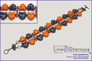 Яркий и забавный браслет с чешским стеклом: сосредоточенные кошачьи физиономии - как пить дать, участники шахматного турнира