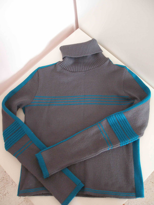Свитер тёплый, оригинальный рисунок (серый с бирюзовыми полосками), состояние хорошее. 320 р.