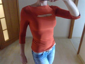 3/ Джемпер рыже-терракотовый необычного цвета, тянущийся, с сексуальным разрезом, зрительно увеличивает грудь. Размер 40-42. 380 р. У меня широкие плечи, мне узковат.