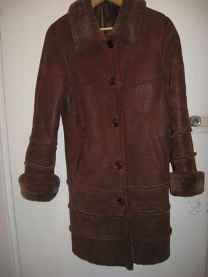 Дубленка коричневая, размер 42-44, при росте 160 см прикрывает колено, очень качественная и теплая, капюшон отстегивается, 2000 руб