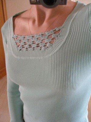 1/ Джемпер светло-изумрудного цвета с ажурным декольте, р-р 42, можно и на 44. Трикотаж, состав – холодная вискоза (гладкая, не скатываемая ткань). 430 р.