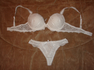 Продам комплект белья, белого, но не яркого, ближе к молочному цвета. Бюстгальтер без вкладок, внутри силикон, размер 70В, лямки снимаются, трусики-стринг размер 42, посадка на бедрах средняя. Этикетки срезаны, но не одевался ни разу по причине неподходящего размера ни верха, ни низа)) Комплект очень романтичный, с кружевами,ленточками, смотрится потрясающе) цена комплекта 900 р.