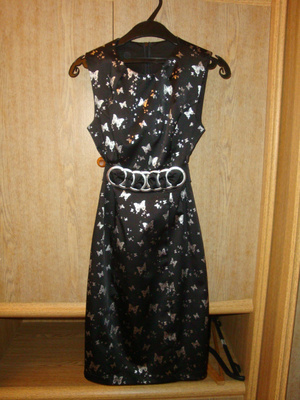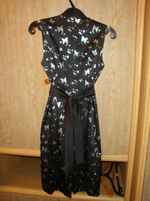 Платье черное, с серебристыми бабочками и лентой на талии, которая завязывается сзади. Размер 42, сидит по фигуре идеально. Причина продажи - покупалось на один раз. Цена - 1000р. Возможно смогу привезти для примерки.