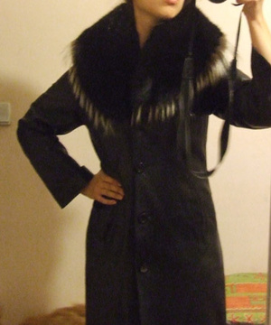 Также продам кожаное пальто, на рост 160 см и ниже, длина чуть ниже середины голени. Размер 44, на узкоплечих. Можно и 42 померить попробовать. Большой, роскошный песцовый воротник (отстёгивается). Пальто нуждается в покраске, есть потёртости. Рукава расклешённые немного, выглядит красиво. Подклад по телу на синтепоне, в рукавах - без. Пальто смотрится красиво, элегантно. Цена: 1000 рублей.