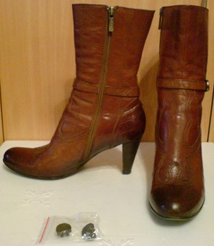 Демисезонные сапожки, 41 р-р, натуральная кожа. Внутри теплая подкладка. Не на полную ногу. Цвет светло-коричневый с "затемнением" на носке и запятнике. Каблук 8,5 см. Родные набойки заменены на более прочный нескользящий материал, и еще остались запасные из комплекта. Состояние сапожек хорошее, надевались всего несколько раз. На правом каблуке пара маленьких дефектов - царапины. Отдам за 800 руб.