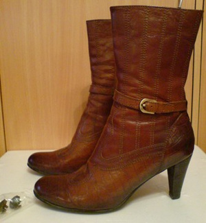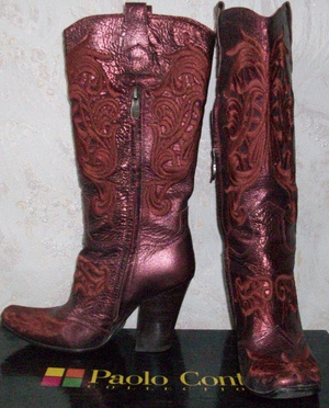 Очень красивые демисезонные сапожки. Маркировка 35 - реально на 36 размер. Натуральная кожа с лазерной обработкой, расшитая орнаментами в русском стиле. Цвет обозначен как бордо, но сапоги мерцают и переливаются. При дневном свете, они бордовые, при искусственном - лиловые. Устойчивый каблук. Все в целом смотрится - глаз не оторвать. Производитель Paolo Conte. Ношены один или два раза.