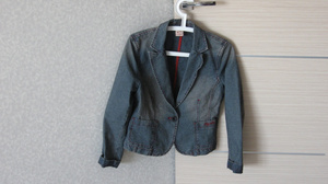 Продам женские жакеты. Черный приталенный, фирма "Madeleine", плечи увеличенные, воротник отделан атласом, р-р 46-48, 600 руб. И джинсовый жакет Sela, 300 руб.