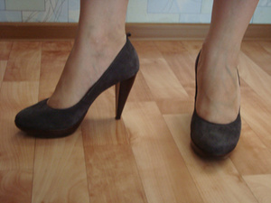 Натуральная замша, темно-серые, каблук 10 см, подошва 1,5 см, удобные, очень классно на ноге смотрятся, цена такая за которую и покупала - всего 1450 р