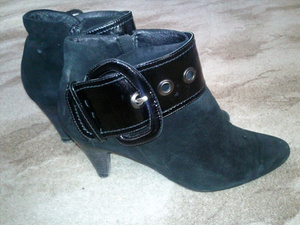 ботиночки на осень, замшевые с лаковым ремнем, цвет глубокий черный (вспышка дала голубой отттенок почему-то). размер 38 (маркировка 37). отдам за 100 рублей в центре- все равно носить не буду. набойки целые.
