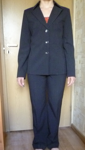1. Брючный костюм, темно-синий в полоску, р. 44-46 (1500 руб.)