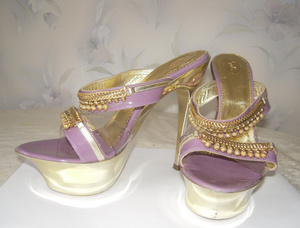 Босоножки Gali (Lebanon) золото+сиреневый, маркировка 35, каблук 14см, платформа 4 см, одевала пару раз и то ходила не по нашим дорогам. 1500.