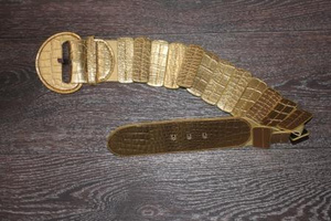 2. Пояс золотой, широкий на резинке, на талию 74 см туговат, можно на верхнюю одежду (сочетается с сумочкой, но чуть поярче), состояние нового, 200 руб.