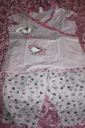 3. НОВАЯ пижамка, симпатичная, р-р 48 (можно 46, кто любит посвободнее, можно и 50, только грудь небольшая), ростовка 164 см (на мой рост 172 штаны до колена, а должны быть бриджами), 300 руб.