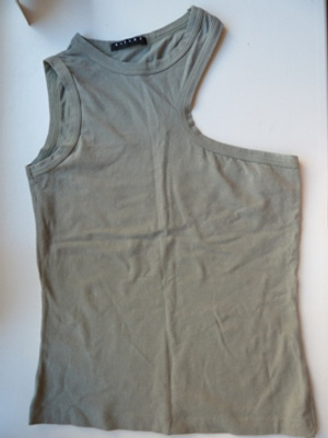 2. топ Sisley, с ассиметричной проймой, р.42, цвет болотный, состояние удовл-е, нижний подгиб сбоку немного отпоролся, 50р.