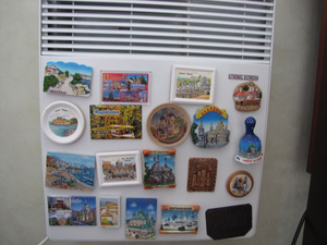 а вот мой холодильник..половина магнитиков осталась дома. надо сказать, что мы ни один не покупали. все это подарки друзей из путешествий, коллег с моей работы и коллег мужа из командировок.
