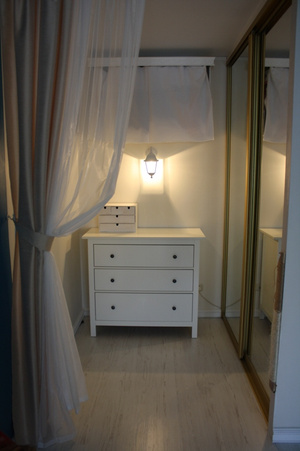 Зеркала большие, во весь рост, есть у шкафов -купе. Бижутерия тоже на полках в шкафу стоит, в различных мензурках и баночках. Была шкатулка но уплыла по моему недосмотру.