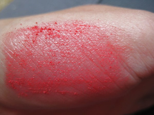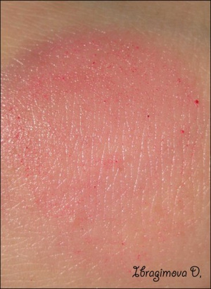 Красиво, правда? Консистенция напоминает сливочно-малиновое сорбе. Оттенок просто невероятный. Но вот, как выглядит бальзам на руке: