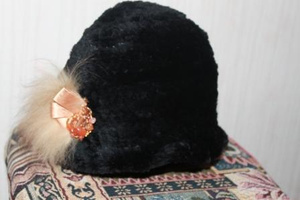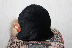 2. Шапка в форме шляпы с опущенными полями, вязаный бобер, черная с рыжим украшением, очень симпатичная, состояние новой, носилась очень мало, на ОГ 56-57, надо мерить, тянется, 1000 руб