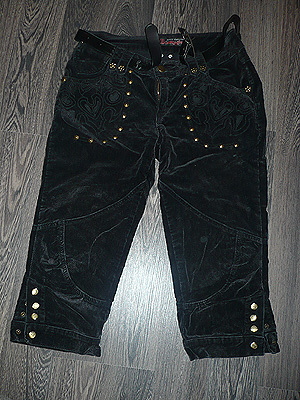 3. Черно-коричневые вельветовые бриджи (на фото не пятно, а блики). Заклёпки, фигурная вышивка и выбивка. Р-р 42-44, пару раз носились. Цена - 100 руб.