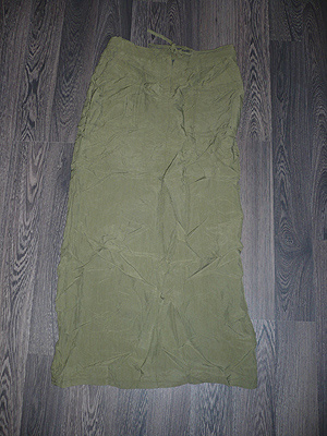1. Зеленая, длинная легкая юбка б/у, сзади разрез, спереди ширинка и завязки в поясе. Два накладных кармана. р-р. 42-44. Ткань легкая, шуршащая. Цена - 100 руб.