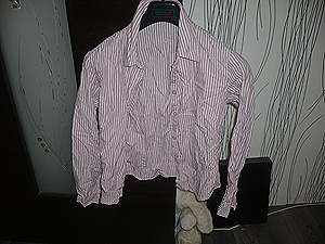 2. Розовая рубашка в серо-коричневую полоску, р-р 40-44 - 150 руб.