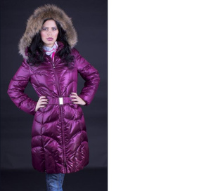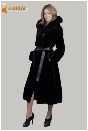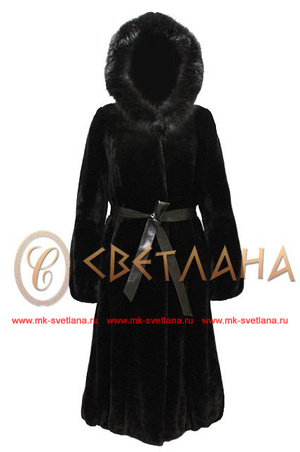 Силуэт полуприлегающий. Капюшон отделан пушниной чернобурка. Рукава и низ изделия присборены. Пояс из кожи (не блестящий), завязывается. Застежка на крючках.