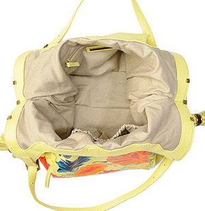 У той, что заказала и получила, спокойный нежно-желтый цвет, она декорирована цветочной росписью под гжель. Декоративные завязки с кисточками. Закрывается на магнитики. Мягчайшая телячья кожа, дорогая фурнитура. Внутри - холщовый подклад. 3 карманчика под всякую мелочь внутри, два, скрытые, с замочками, на фронтальной части. Вместительная. Размеры: высота от донышка до начала ручки-38 см, от донышка до верхнего края сумки - 29, длина -36, ширина донышка - 12 см. Сумка изумительная, но для меня, пожалуй, великовата. Изначальная цена на наши деньги около 10 тыс рублей, по практике при пересечении границы стоимость вырастает вдвое- втрое. (Неадекватное ценобразование, согласна). Куплена с большущей скидкой на мегараспродаже иностранного сайта. Пристрою по себестоимости - 3947. Бирки все при ней - можно брать на подарок.