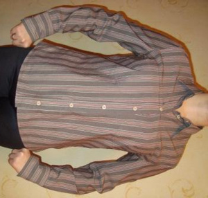 1. Рубашка серая в красно-белую полоску, длина 60см, длина рукава 61см, размер 44, 250р