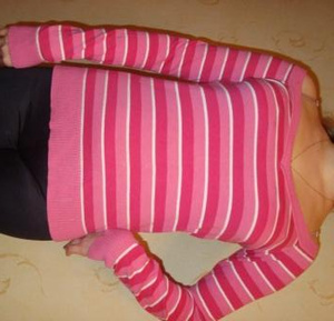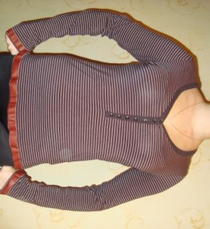 3. Кофта бордовая в розовую полоску, по низу прорезиненая полоска, размер 42-44, длина 59см, длина рукава 64см, 250р
