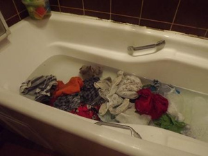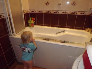 Вчера вечером стала наливать Ванюхе ванну, купаться, а сама пошла игрушки его убирать. Пришел муж, помогает мне. Я говорю, а Ваня где? Он - да возле ванны стоит, смотрит, как вода наливается. Ну, думаю, ладно! Потом слышу счастливые вопли. Прихожу, а эта радость вытаскивает все вещи грязные из бачка и скидывает в ванну!