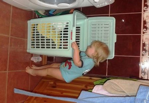 .... а эта радость вытаскивает все вещи грязные из бачка и скидывает в ванну!У нас Нюся вытаскивает вещи из стиралки и складывает в ванну. Затем закрывает стиралку и тычет кнопки, типа включает. Объясняю ей, мол а стирать-то нечего, такой недоуменный вид у нее. Но из ванны я ее гоняю, т.к. она грызет саму ванну и ее прям мааанит унитаз.![]()