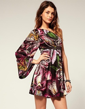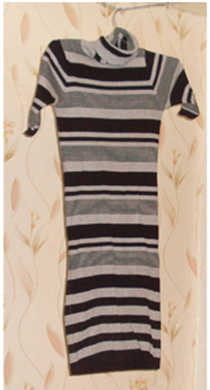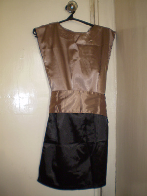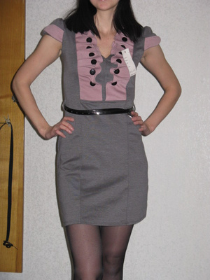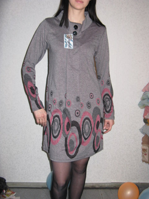 4. Платье Berschka c рисунком волка спереди. Рукава наполовину трикотажные, в пройме расклешеные, от середины трикотаж в обтяжку. По низу платье отрезное трикотажное, с замками по бокам. Цена 1000 руб.