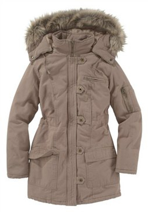 Практичная парка со множеством карманом. Съемный капюшон с искусственным мехом и завязками. На молнии плюс на кнопки. Длина около 82 см. Покрой хорошо подчеркивает фигуру. Материал: ноская ткань из 100% хлопка (ткань типа парусины). Подкладка и утеплитель из 100% полиэстра. Искусственный мех: 100% полиакрил.