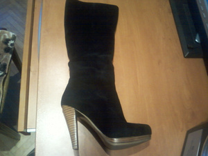 - сапоги черные замшевые высокие "еврозима"( теплая зима-нетеплая весна) р-р 36, б\у недолго, набойки родные, каблук - 10см, платформа - 1,5см - по весенней цене - за 350руб.