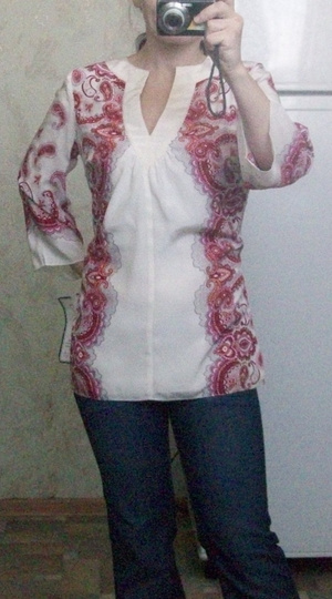 Шелковая рубаха-туника INC international concepts в русском стиле, расписная. Белая с легким кремовым оттенком с орнаментом в розовых тонах. Рукав три четверти. Сбоку - замок. Есть подклад, поэтому не особо просвечивает. Нарядная, как говорят: "веселенькая". На ощупь очень приятная. Думаю, в ней будет комфортно и летом, и зимой, потому что шелк -такая хитрая ткань: летом - не жарко, в холодное время года - не холодно. Мне большевата. Ношу американскую "2". Это "4" на 44-46. На нужном размере будет полуприлегающего силуэта. Фото с сайта затерялись, поэтому здесь реальные картинки. Продам за 1450.