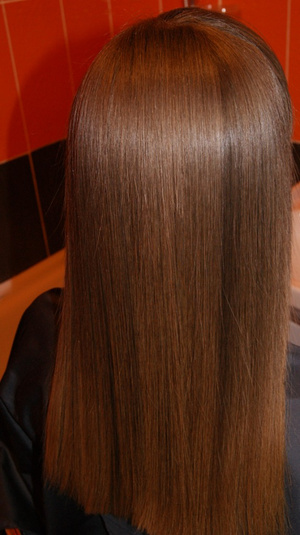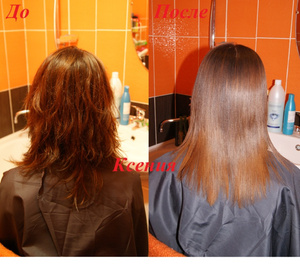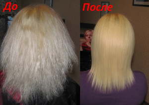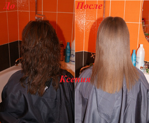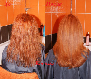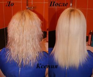 Ещё моя работа. До- пористый, безжизненный волос, концы обламывались при расчёсывании. После лечения волосы становятся послушными, перестают ломаться, приобретают силу и блеск.