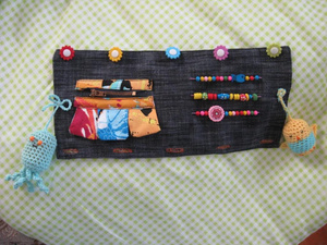 еще одна фотка не загрузилась. Птичка и осьминожек гремят, замочек можно расстегивать-застегивать, лепестки шуршат, бусинки для развития моторики