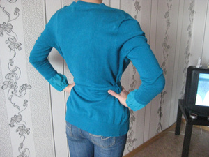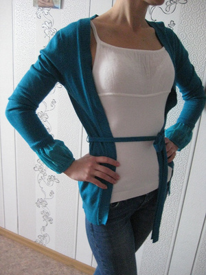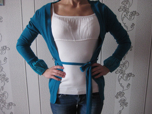 Трикотажный легкий кардиганчик красивого бирюзового цвета, на поясе. Можно носить с любым другим