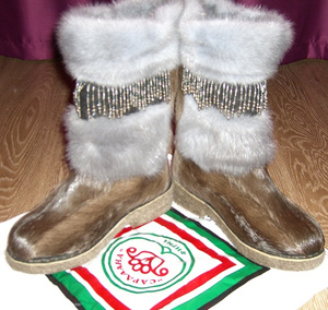 Продаю шикарные якутские унты из темных оленьих лапок с отделкой из голубой норки и бисера. Абсолютно новые, т.к. не подошли по размеру. Размер - 37,5-38. Цена - 20 тыс.руб., возможен разумный торг.