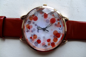 1) Часы новые: красный циферблат+красный ремешок, синий циферблат+белый ремешок. Диаметр циферблата 4,5 см. Ремешок под лаковую кожу, длина 23см, подойдет на большой обхват запястья. Смотрятся очень необычно! 400 рублей за каждые.