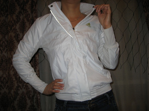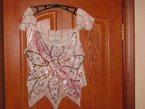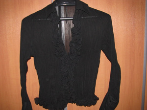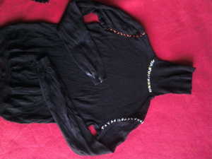 Атласная кофточка на замке, «собачки» украшены стразами, резинка с люрексом, смотрится просто шикарно, сделано в Турции, не пришлось поносить, этикеток нет, размер 40-44, цена 1000 руб.