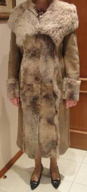 вторая бежевая шубка - gani стриженная овчинка+ норка+ бусинки и кожа,очень красивая, практически не носилась, т.к. то беременая я была, то худела. рр от 40 до 44 думаю нормально (указан S).